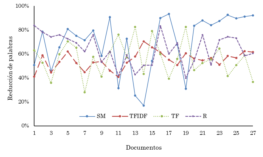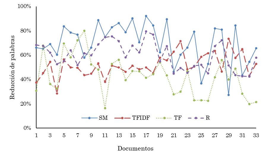 La Figura 3 presenta el porcentaje de reducción de palabras obtenidas en el resumen de las noticias empleando el método basado en matriz de similitud (SM), las métricas TF-IDF y TF, y el resumen de referencia (R). El algoritmo basado en la matriz de similitud presenta los porcentajes de reducción más altos en la mayoría de los documentos, incluso comparado con los porcentajes de reducción obtenidos por el resumen manual. En promedio, el algoritmo basado en la matriz de similitud obtuvo una reducción del 70 % de las palabras de las noticias, con una desviación estándar del 23 %. En el caso del resumen de referencia, el porcentaje de reducción promedio fue del 64 %. Para los métodos basados en frecuencia se obtuvo un 55 % y 56 % de reducción empleando TF-IDF y TF, respectivamente.