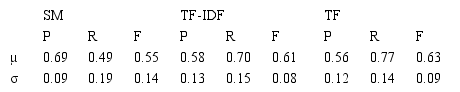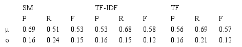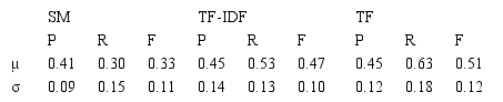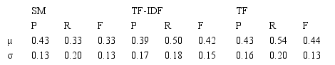 La Tabla 1 presenta el promedio (µ) y la desviación estándar (σ) para la precisión (P), sensibilidad (R) y valor F de la métrica ROUGE-1 para cada uno de los métodos evaluados. De acuerdo con la precisión, el mejor resumen fue obtenido por el método basado en la matriz de similitud con un 69 %. Sin embargo, en términos de sensibilidad, el mejor resultado lo presenta el algoritmo basado en TF con un 69 %. El valor F más alto es obtenido con el algoritmo TF-IDF con un 58 %. Al observar la desviación estándar de la Tabla 1, se ve que la precisión para todos los métodos es de 16 %. El valor más alto para R y F, lo tiene la matriz de similitud con un 24 % para R y un 15 % para F. ROUGE-L se presentan en la Tabla 2. En este caso, de acuerdo con la precisión, el método basado en la matriz de similitud como TF obtiene 43 % de precisión. El método TF obtiene el mejor resultado de acuerdo con la sensibilidad (54 %) y valor F (44 %). Las desviaciones estándar varían entre 13 % y 20 % para todas las métricas.