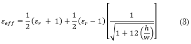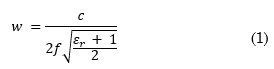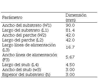 Este substrato podría sustituir al FR4. Substratos más gruesos disminuyen las pérdidas de ganancia debido a la reducción del cobre por el diseño de la antena [24] y la línea de transmisión se diseña para una impedancia de 50 Ω. Las ecuaciones (1) a (4) determinan las dimensiones del parche rectangular.