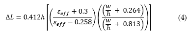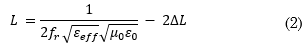 Utilizando (1) y (2) se calcula el ancho y largo del parche. De las anteriores ecuaciones se calcula que la εeff , μ0 y ∆L es la constante dieléctrica efectiva, la permeabilidad del espacio libre y la longitud de la extensión, respectivamente, c es la velocidad (3 × 108 m/s), f es la frecuencia de operación y εr es el índice efectivo del substrato. La optimización en el gráfico de parámetros de pérdida de retorno se realiza modificando los valores de dimensión utilizando la función de barrido paramétrico en Computer Simulation Technology Microwave Studio (CST-MWS).