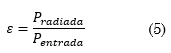 La eficiencia de radiación es un parámetro para evaluar el rendimiento de una antena, ya que describe qué también una antena irradia la potencia aceptada en su alimentación. La eficiencia es la relación entre la potencia radiada y la potencia entregada a la antena.