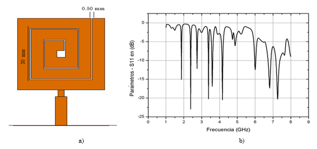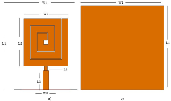 Debido a las características de polarización circular y a las características de antena multibanda para aplicaciones de captación de energía de RF, este documento tiene como objetivo investigar el diseño de antenas de microcinta con ranuras en espira rectangular en el parche resonante para lograr una buena ganancia y así recolectar la mayor cantidad de energía circundante en el ambiente. El diseño final de la antena se presenta en la Figura 1: a) parte frontal (parche radiante de la antena, diseño en espiral cuadrada), y b) parte posterior (plano de tierra de la antena). De igual forma, las dimensiones de la antena propuesta se presentan en la Tabla 1.