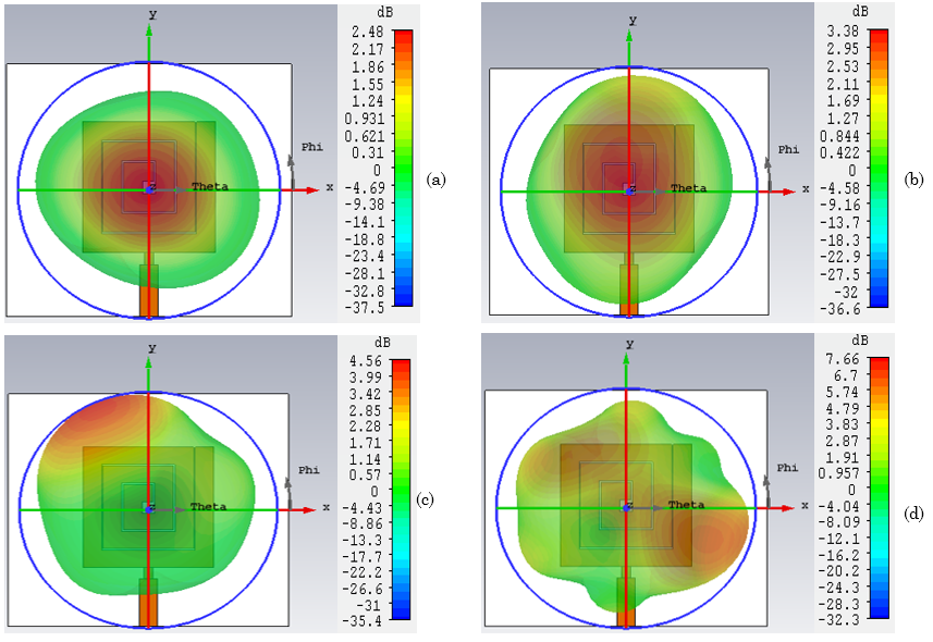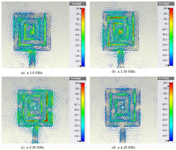 En la Figura 11 se observa que el comportamiento de la distribución de corriente superficial vectorial en el parche radiante gira sincrónicamente debido a las ranuras en forma de espira, llenando los espacios y generando una polarización circular hacia la derecha y hacia la izquierda. En la Figura 11a), la corriente superficial comienza a tomar fuerza a partir de la ranura interna. En la Figura 11b), las corrientes superficiales se concentran a lo largo de las ranuras del parche y la dirección opuesta conduce a una banda de operación WLAN al igual que la Figura 11c) y la Figura 11d). Los colores cálidos indican mayor concentración de corriente, los colores fríos indican menor circulación de corriente por las ranuras.