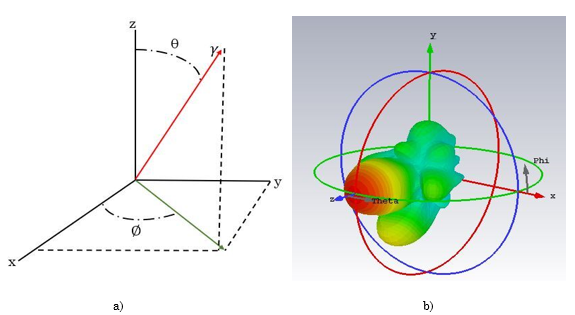 El diagrama de radiación de una antena se define como la representación gráfica de las características de radiación en función de la dirección angular. Habitualmente se utiliza un sistema de coordenadas esféricas (γ, θ, ∅), como se observa en la Figura 12a), donde también se puede ver de forma animada. Asimismo, es factible representar el campo eléctrico, magnético o la densidad de potencia radiada. Dado que los campos son magnitudes vectoriales se puede representar el módulo o la fase de sus componentes. Igualmente, las formas de representación tal vez sean tridimensionales o bidimensionales, en escalas lineal o logarítmica. La Figura 12b) es la representación tridimensional de los campos radiados por una antena.