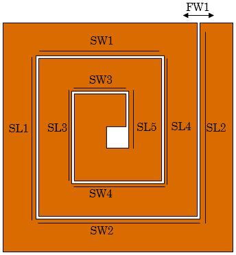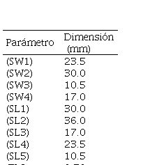 En la Figura 2 se presenta el parche radiante con las dimensiones de las ranuras que forman la espiral cuadrada, estas dimensiones se especifican en la Tabla 2.