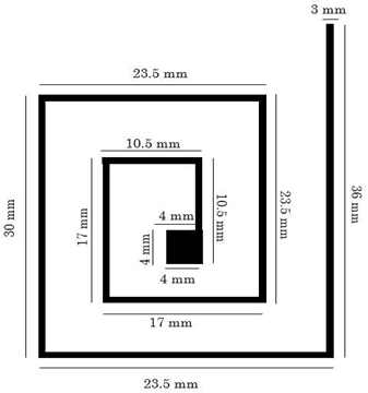 Los cálculos iniciales para la antena propuesta se realizan para un diseño destinado al rango de 2.4 GHz. A partir de los resultados preliminares, se hace una ranura a lo largo del parche radiante con dimensiones de 10 mm x 1 mm para ajustar la frecuencia deseada. Sin embargo, al no lograr que las bandas de resonancia iniciales se desplazaran hacia la izquierda buscando la frecuencia deseada, se replica la ranura inicial formando una figura en forma de rectángulo dentro del parche radiante; al no obtener la frecuencia deseada, se opta por formar una espira cuadrada. El software CST permite construir diferentes figuras que se pueden encajar en el diseño planteado, se forma la espiral cuadrada con iguales características de grosor que el cobre empleado en el parche radiante se procede a incrustar esta espira en el parche y se utiliza la herramienta sustraer para perforar dicho parche en el cual se genera la ranura en espira. En la Figura 3 se aprecian las dimensiones iniciales de esta. En la simulación se aplicó el método de dominio de elementos finitos (FEM, por sus siglas en inglés) y un solucionador de dominio de frecuencia donde se calculan estructuras resonantes como filtros, sistemas multipuertos conectores y arreglos.