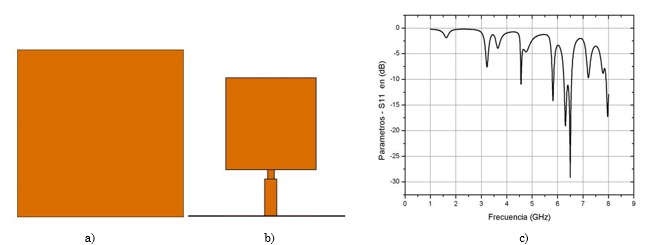 Como se puede apreciar en la Figura 4, la antena sin ranuras presenta tres bandas de frecuencia en 5.8 GHz, 6.5 GHz y 7.9 GHz y los parámetros (S11) indicando la medida de acoplamiento de la impedancia de la antena.