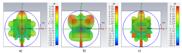 El patrón de radiación es un gráfico que representa la fuerza de los campos electromagnéticos emitidos por una antena. La ganancia es la característica más importante de una antena. Es la potencia de amplificación de la señal, representa la relación entre la intensidad de campo que produce una antena en un punto determinado. La unidad para medir la ganancia es el decibelio (dB). La frecuencia de resonancia de una antena es aquella frecuencia en la que se entrega la máxima potencia al parche radiante, es decir, cuando ocurre la mejor adaptación de impedancia entre la línea de alimentación y el parche. En la Figura 5 se presentan los patrones de radiación simulados de cada frecuencia con su respectiva ganancia en dB, indicada en la barra de colores ubicada a la derecha de cada figura, siendo la ganancia más baja representada en colores fríos y la ganancia más alta interpretada por colores más cálidos.