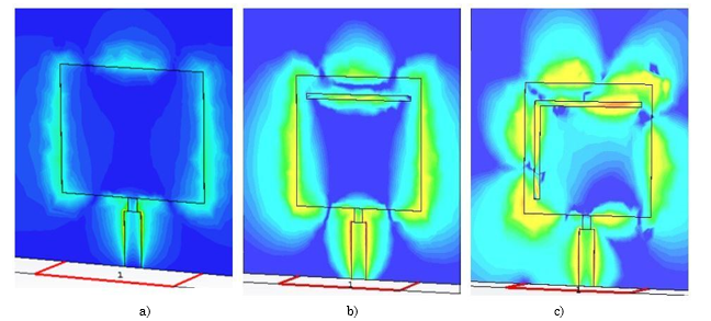 En la Figura 6a) se observa el flujo de corriente de superficie que circula el borde del parche radiante cuando este no presenta ninguna perturbación por ranura; en la Figura 6b), el flujo de corriente aumenta y comienza a llenar el vacío producido por la ranura en el parche radiante; en la Figura 6c), el flujo de corriente va llenando los vacíos producidos por la nueva ranura.