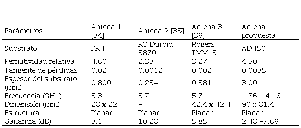 En la Tabla 3 se presenta la comparación de antenas simuladas con diferentes substratos junto a la antena propuesta.