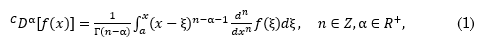 In this study, we employ Caputo’s fractional derivate [23] because the initial condition problem can be more easily solved with it rather than using other definitions of fractional derivatives [24], [25]. Formally, being the order of the derivative and 𝐶𝐷 denoting the derivative with respect to Caputo’s derivative, which is defined as in (1).