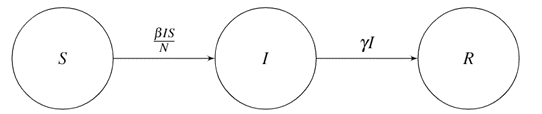 The SIR model considers a one-way infection transition among the populations sets (S, I, and R). Susceptible individuals could get infected or remain susceptible; infected individuals could only recover or remain infected; and recovered individuals represent the final stage of the model (see Figure 1).