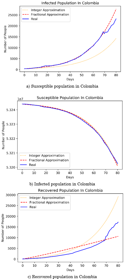 The optimal orders of the derivatives obtained by the algorithm for the fractional model are: 0.52 for the differential growth of the susceptible population in Colombia, 0.72 for that of the infected population, and 1.12 for that of the recovered population. Regarding the parameters, the number of people infected per day by a single infected person (i.e., parameter 𝛽) was 0.1424499 and the frequency of recovered (i.e., parameter 𝛾) was 0.09640691 for the integer model. For the fractional model, 𝛽 and γ were 0.35 and 0.23, respectively. The order of the fractional differential equation shows that the evolution of the susceptible and infected populations has a differential behavior that is much lower than that provided by the entire model. This implies that, although the virus propagation dynamics had no initial control, its propagation was limited by environmental conditions or factors exogenous to the current model. Moreover, the growth rate of the recovered population is higher than the integer, which indicates that the Colombian population experiences an accelerated recovery rate.