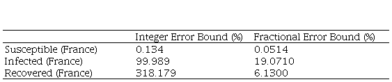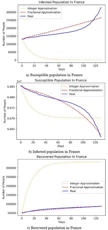 The difference between the differential orders of the susceptible and infected populations is determined for two reasons: (1) due to the difference between the quantities handled by the populations, since the scale of susceptible individuals is much larger than that of infected individuals; hence, the system proportionally balances the quantities based on their differential growths, and (2) because exogenous factors (e.g., the environment and the population density in regions with high infection rates) endorsed a greater survival of the virus in potential inorganic entities that transmit the disease. Table 2 shows the error comparison between the integer and fractional models, on the other hand, the Figures 3a), 3b), and 3c) show the approximation of the fractional model and the integer model fitted to the French data.