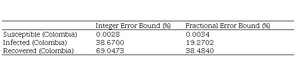 The Bound Optimization BY Quadratic Approximation (BOBYQA) gradient-free minimization algorithm was used to perform iterative minimization [30]-[32]. We implemented this algorithm because changes in the order of a derivative produce gaps in calculating the error, thus yielding discontinuity, and avoiding derivatives in all the intervals of interest. The maximum error for the Colombian model is presented in Table 1.