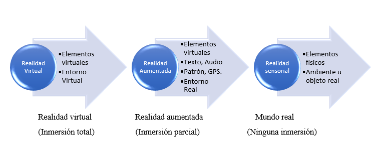 Para interpretar mejor el concepto de realidad aumentada, en el esquema de la Figura 1 puede observarse el tipo de ambiente, los elementos que los constituyen y el grado de inmersión que se experimenta con realidad virtual, realidad aumentada y un escenario real percibido por el estudiante o el docente.