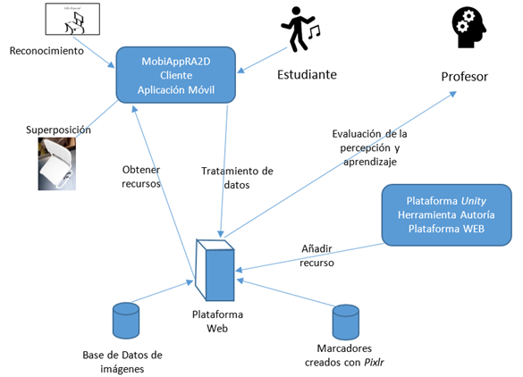 De los datos obtenidos en el estudio piloto se determinó la aplicación Android con un tamaño de 50 megas de memoria, la cual se reprodujo a través de la plataforma de desarrollo Unity en combinación con la herramienta de desarrollo de realidad aumentada Vuforia. La aplicación Pixlr facilitó que los marcadores alcanzaran un reconocimiento óptimo de 4 a 5 estrellas en Vuforia para que el tiempo de reconocimiento fuera el mínimo posible. El proceso de funcionamiento de la aplicación se puede ver en la Figura 2.