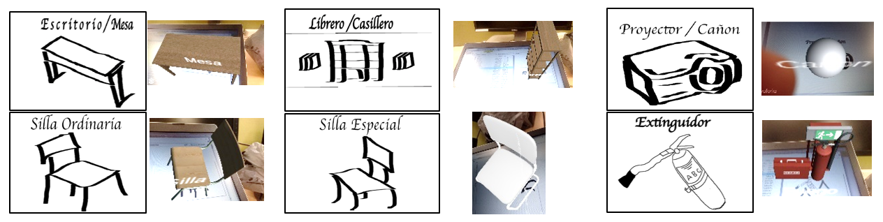 Fuente: [22].Se emplearon dispositivos móviles telefónicos o tabletas con alguna versión del sistema operativo Android mayor a la 5.0 o tableta modelo Android 5.0 o mayor, con espacio disponible para la aplicación (60 Mb), así como marcadores impresos en papel en donde existía uno por cada tipo de mobiliario en el salón de clases (silla ordinaria, silla por necesidades o atenciones especiales, mesa del profesor, librero, proyector y equipo contra incendios) pudiendo emplear más de un marcador de cada tipo. Se les distribuyó una dirección web para la descarga de aplicación por internet. En el caso que se presentaran limitantes con la conexión a internet, era posible instalar la aplicación por vía un cable conectado a la computadora del maestro, o empleando Bluetooth como medio de transferencia entre la computadora y el dispositivo móvil sin tener que acceder a internet.