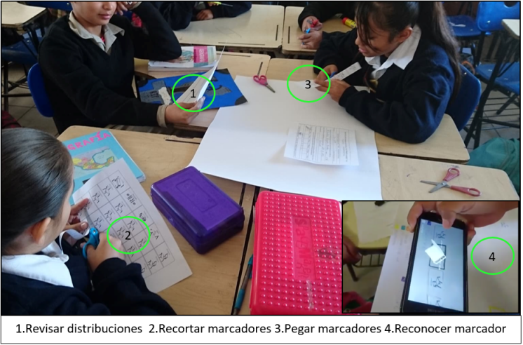 Se realizó una actividad educativa en tres escuelas de Mexicali (dos de la ciudad y una del Valle de Mexicali); cada grupo participante tenía un promedio de 35 estudiantes por grupo, se trabajó con la aplicación de Aurasma para el reconocimiento de patrones de realidad aumentada, los cuales mostraban un video con una situación de riesgo para que los estudiantes las identificaran en un mapa de riesgo para la escuela; el instrumento diagnóstico de los equipos disponibles arrojó la siguiente información: la mayoría usa celular (74), de los cuales 50 son de plataforma Android y 24 son de Apple / iOS, la definición de la cámara está en el rango de 3 a 12 megapíxeles, y el tiempo de reconocimiento por marcador tuvo una frecuencia de 8 segundos o más.