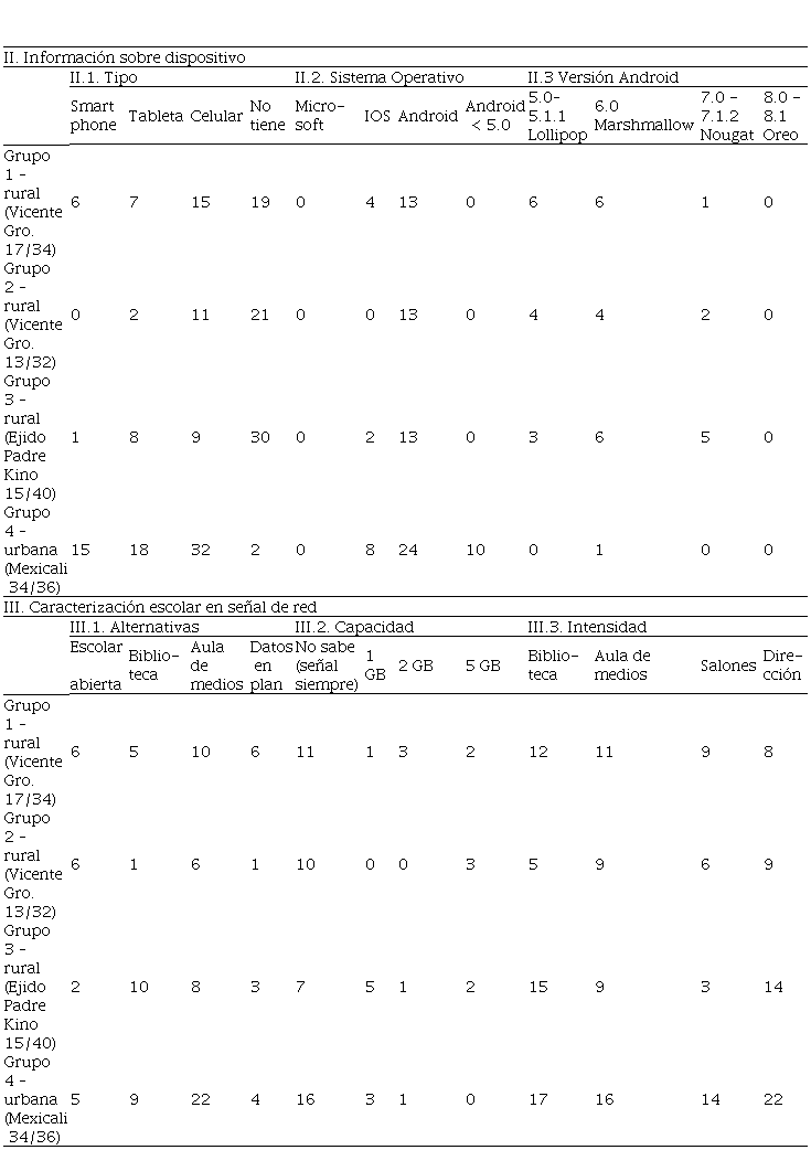 Resultó de gran importancia realizar un análisis contextual inicial de las características de los servicios de comunicación, de la infraestructura y de las características propias de la comunidad estudiantil, considerando aspectos sociales como lo son el sector dentro de las actividades económicas en las que se desempeñan los padres o el acceso a equipo de cómputo o dispositivos móviles y la conectividad a internet en casa o en la escuela, resultando esta última una limitante. Esta información permitió contextualizar mejor el escenario sobre la disponibilidad de celulares, el tipo y modelo de sistema operativo, las alternativas de red disponibles, así como la experiencia previa en actividades educativas; los datos recabados demostraron poca disponibilidad de dispositivos móviles en Vicente Guerrero y Ejido Padre Kino, y menor experiencia con software o tecnología educativa en estas dos escuelas comparadas con el entorno urbano.