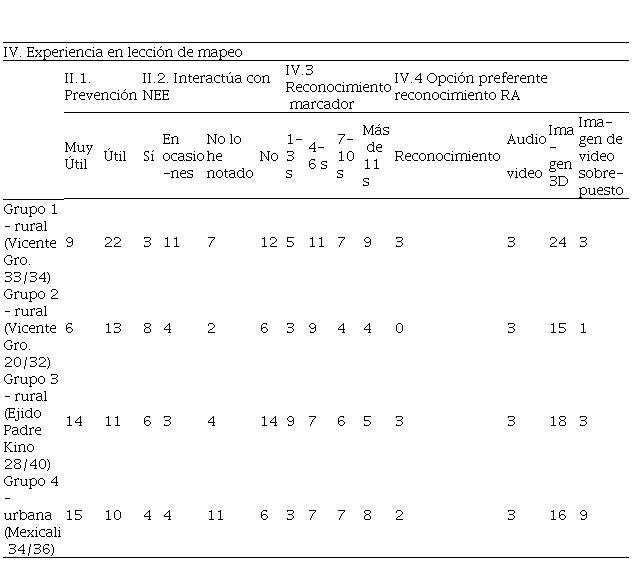 En la columna IV.2 Complejidad, se puede observar que les resultó Fácil o Muy fácil, pero sólo en el Grupo 4 de la Escuela C en Mexicali, a 9 de 34 (26 %) les resultó difícil la actividad. En el tiempo de reconocimiento los cuatro grupos tuvieron un tiempo mayor de 4 segundos, quedando de la siguiente manera: 81.82 %, 85 %, 64.24 %, 64.70 %, respectivamente del grupo 1 al grupo 4. Finalmente, en la columna referente al IV.4 Opción preferentedeRA, la mayoría optó por Imagen 3D virtual, con 70.58 %, 75 %, 64.28 % y 47 %, respectivamente.