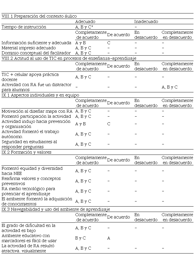 1) Preparación del contexto áulico, los docentes estuvieron” Completamente de acuerdo” en cuanto a: ’Material impreso adecuado’ y ’Dominio conceptual del facilitador’; en ’Información suficiente y adecuada’, uno se mostró “De acuerdo” y los otros dos “Completamente de acuerdo”. En cuanto a VIII. 2) sobre Actitud al uso de TIC en procesos de enseñanza-aprendizaje, coincidieron en que usar TIC y celular apoya la práctica docente, pero que el uso de RA no fue considerado como un distractor significativo para los estudiantes; en IX.1 Aspectos individuales y de equipo, coincidieron en que hubo ‘Motivación’, ‘Participación’, ‘Fomento del trabajo autónomo’ y ‘Seguridad al contestar preguntas’; referente a IX.2 Formación y valores: coincidieron en la alternativa “Completamente de acuerdo” en que “Fomentó equidad y diversidad hacia NEE”, “Reafirma valores y conceptos preventivos”, “RA medio tecnológico para potenciar el aprendizaje” y “El ambiente fomentó la adquisición de conocimientos”. Referente al IX. 3) Navegabilidad y uso del entorno de aprendizaje, los docentes consideraron que fue sencillo y atractivo visualmente, pero sólo un maestro estuvo “De acuerdo” sobre la facilidad de uso y los otros dos estuvieron “Completamente de acuerdo”.