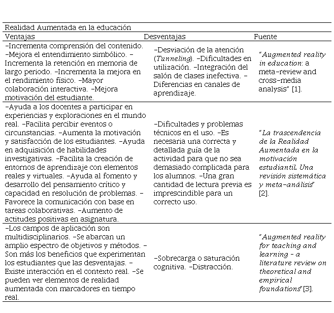 Existen distintos proyectos e investigaciones sobre realidad aumentada en educación, sobre los cuales se han identificados ventajas y desventajas al implementarlos (ver Tabla 1).