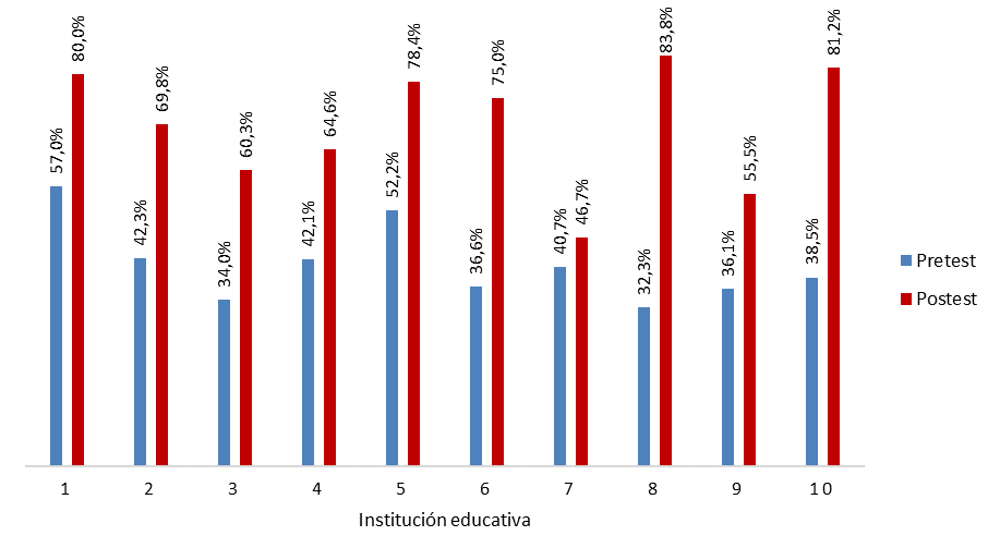 Por otro lado, se tienen como insumos los proyectos de las diez instituciones educativas objeto de estudio de esta investigación, luego de la implementación de las aplicaciones móviles educativas diseñadas y desarrolladas por docentes de diferentes áreas de desempeño. En la Figura 9 se muestran los resultados comparativos por porcentaje de pretest (prueba diagnóstica) y postest (prueba de validación) promediados, al realizar la implementación del modelo de desarrollo de esta investigación, desarrollado por los docentes no programadores en cada institución educativa.