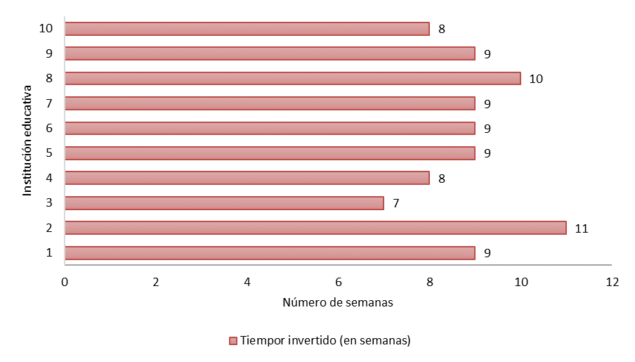 A continuación, se presentan en la Figura 10, los tiempos de trabajo representados en números de semanas invertidas por los docentes para el desarrollo de las aplicaciones móviles en cada una de las instituciones educativas involucradas en este estudio. Desde el momento en que se identifica la problemática de aprendizaje en las áreas básicas del saber, los docentes proceden a diseñar la aplicación móvil educativa con la que se realizará la intervención pedagógica. Para ello siguen cada una de las fases del modelo de desarrollo expuesto en este artículo.