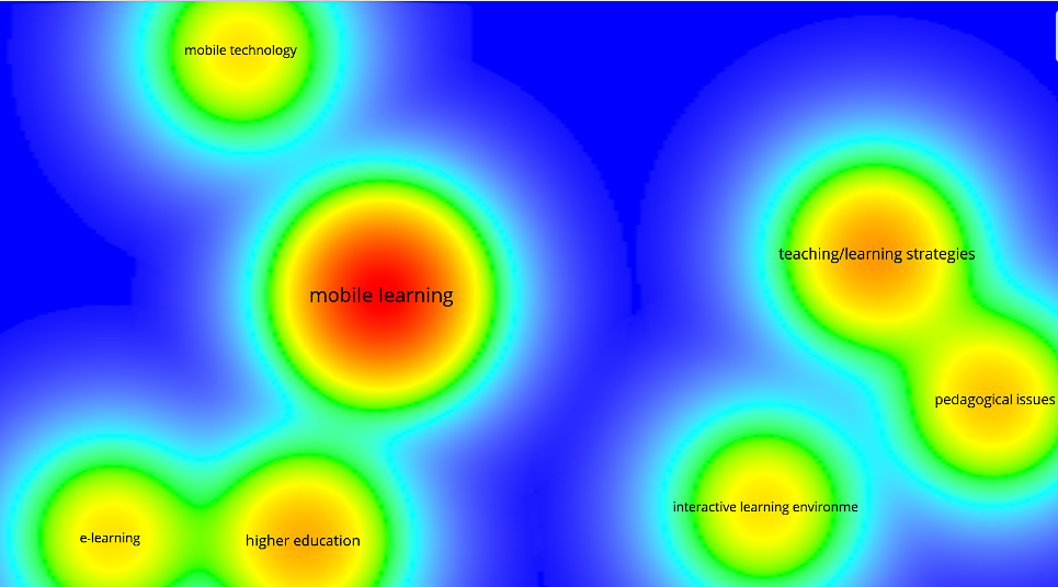 Los colores de la Figura 1 próximos al rojo muestran las zonas de mayor densidad de coocurrencias de palabras clave; los colores próximos al amarillo y verde muestran las zonas de menor densidad de coocurrencias de palabras clave.