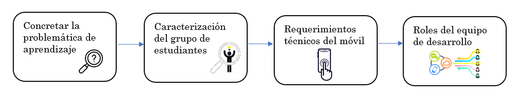 En esta fase se concretan algunas características de usuarios finales, con su problemática de aprendizaje y los requerimientos técnicos acorde al contexto de la institución educativa que permitan el desarrollo de aplicaciones móviles. La Figura 3 muestra las etapas de esta fase.