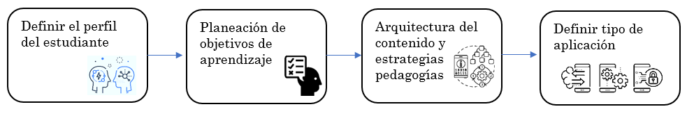 En la etapa de definir el perfil del estudiante, se establece el nivel de desarrollo cognitivo a través de la identificación de los procesos mentales y estilos de aprendizaje, conocimientos previos, discapacidades o limitaciones cognitivas, habilidades y competencias, de tal forma que se puedan definir perfiles de comportamiento en común para contextualizar los contenidos a los intereses y necesidades del grupo de estudiantes con quienes se implementa la propuesta de la aplicación móvil educativa.