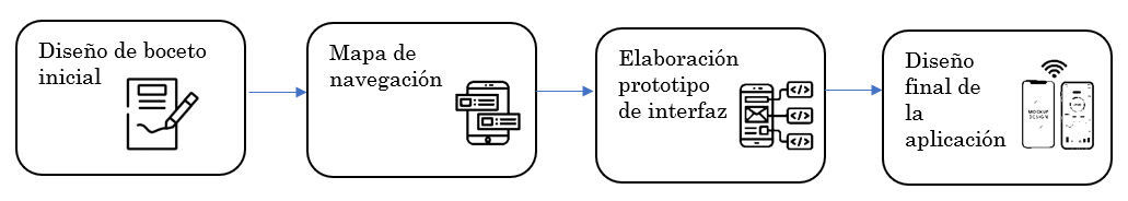 En esta fase se elaboran los diseños visuales acordes a la arquitectura de información de la aplicación móvil educativa, definida en las fases anteriores, se elaboran elementos tales como: sketch (boceto inicial), wireframes (mapa navegación y prototipo de interfaz de usuario) y mockup (diseño final de interfaz de usuario) [43]–[47] en los que se muestran de forma clara la organización de los recursos y elementos constituidos en la aplicación. Sus etapas se presentan en la Figura 5.