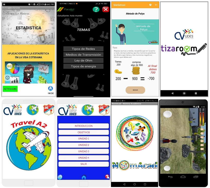 En la Figura 7 se presentan algunas aplicaciones móviles logradas por los docentes sin experiencia en programación luego de seguir las fases del modelo de desarrollo presentado en este artículo.
