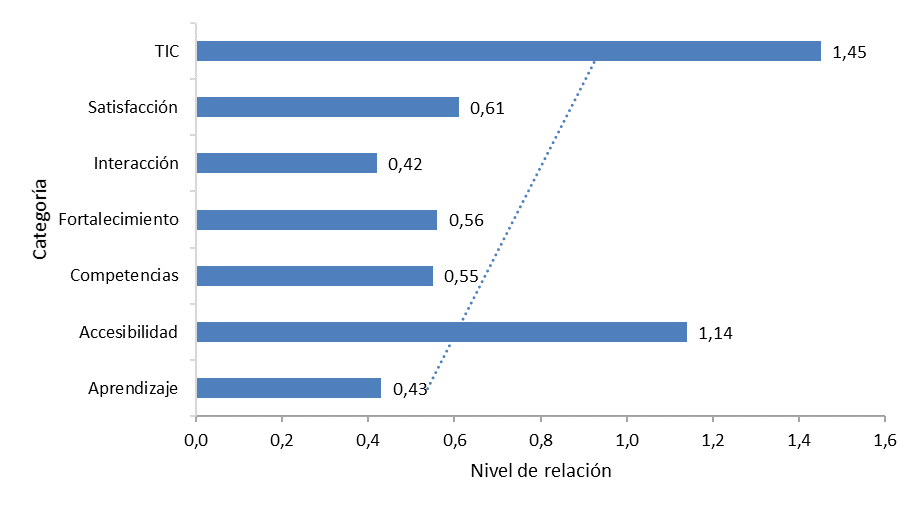 En la relación establecida desde la categoría Avances, que valora en alto nivel los logros alcanzados por la población objeto de estudio. Esto se materializa al entretejerse con la categoría TIC, la cual se ve reflejada en el más alto valor con 1.45 %, en tanto se reconoce como herramienta mediadora para el mejoramiento de los aprendizajes (variable que, a su vez, tiene un 1.14 %). Con relación al fortalecimiento se reconoce en un 0.56 %, lo cual se avala desde una organización didáctica, mediada por unas aplicaciones móviles enlazadas en unas actividades que impactan y cuya satisfacción es reconocida en 0.61 %, a través de la interacción, visibilizada en un 0.42 %.