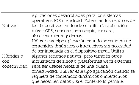 Definidas las etapas anteriores de esta fase, continua la etapa de definir el tipo de aplicación móvil que se pretende desarrollar, atendiendo las diferentes características de las mismas y a las necesidades del contexto [41], [42], como se muestra en la Tabla 1: