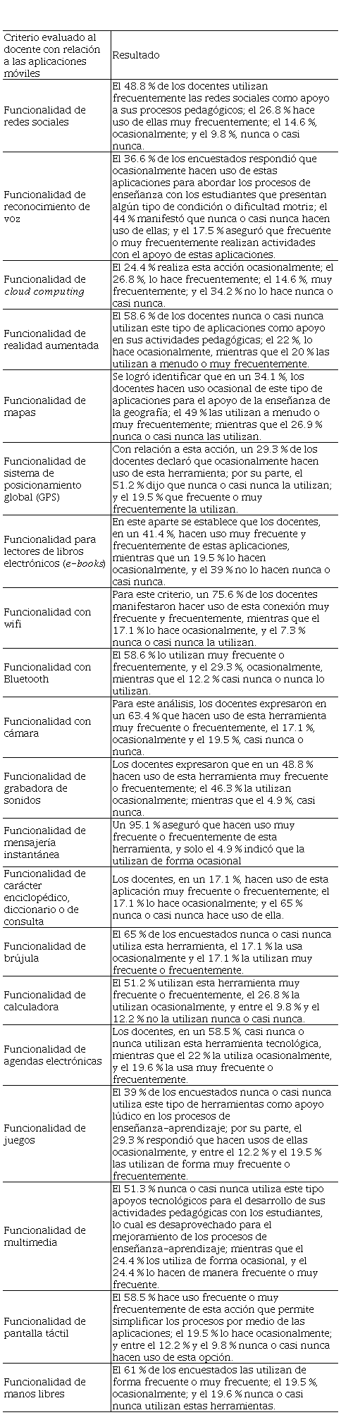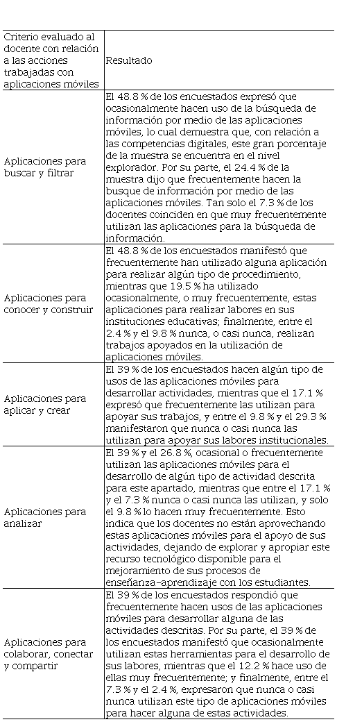 Con el diseño e implementación de un instrumento adaptado a los docentes se busca conocer la frecuencia con que ellos usan las aplicaciones móviles como herramientas didácticas mediadoras en el proceso enseñanza-aprendizaje; a partir de los resultados arrojados por este instrumento diagnóstico, se consolidan las bases para la puesta en marcha de la estrategia tecno-pedagógica basada en el modelo de desarrollo de aplicaciones móviles educativas. En particular, la fase diagnóstica inicial permitió establecer el nivel de uso y su apropiación en la educación básica y media, y así tener un referente para medir el impacto de la implementación del modelo al final del proceso investigativo. En este sentido, los resultados presentados en las Tablas 3 y 4. (La Tabla 3 hace referencia a tipos de aplicaciones y la Tabla 4 a funcionalidades que podrían tener cualquiera de esos tipos) evidencian que hay un desconocimiento generalizado por parte de los participantes en las posibilidades que ofrecen las aplicaciones móviles para dinamizar las actividades orientadas a favorecer las competencias digitales en los estudiantes. Aunado a lo anterior, se comprueba la necesidad de formar a los docentes en el uso de los recursos y herramientas digitales.