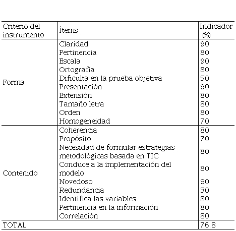 De acuerdo con los ítems del cuestionario, en cuanto a los criterios de forma y contenido, se obtuvieron los resultados como se muestra en la Tabla 5 (el promedio general es de 76.8 %, lo que indica un coeficiente de competencia bueno para los expertos que validaron el instrumento).