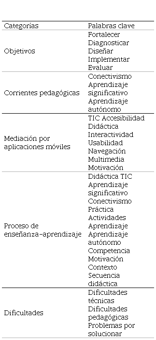 Se encuentra en los resultados una relación directa entre los objetivos y las palabras clave: fortalecer, diagnosticar, diseñar, implementar y evaluar, las cuales se convierten en procesos utilizados por el grupo de participantes en el momento de implementar estrategias didácticas y metodológicas con la utilización de aplicaciones móviles (ver Tabla 6). Como corrientes pedagógicas se encuentran que las más utilizadas corresponden al conectivismo, aprendizaje autónomo y significativo. El primero en mención está estrechamente relacionado con el aprendizaje para la era digital [78]–[80], esto quiere decir que dentro de la configuración del nuevo escenario de enseñanza-aprendizaje la tecnología juega un rol significativo. Es preciso mencionar aquí que, en la educación mediada por las tecnologías, es necesario la búsqueda de estrategias didácticas [81] o modelo de enseñanza que permitan una implicación del estudiante dentro de su proceso de aprender. Esto último en coherencia con el aprendizaje significativo.