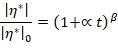 Donde |η*| es la viscosidad compleja del sistema formado por la solución sobresaturada y los microcristales, |η*|0 es la viscosidad compleja inicial del sistema, que corresponde a la solución de sacarosa sobresaturada, ya mezclada al jugo concentrado, t es el tiempo de cristalización y α y β son parámetros empíricos de [26].