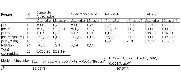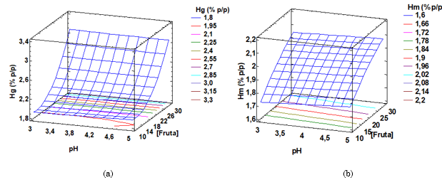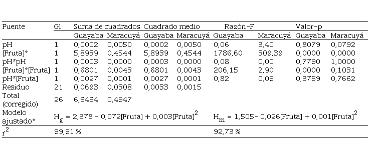Humedad: El análisis de varianza (ANOVA) para la humedad de cocristalizado de pulpa de guayaba (Hg) y de jugo de maracuyá (Hm) (Tabla 2), muestra que la interacción no presentó diferencia significativa (con un nivel de confianza del 95,0 %), al igual que los efectos principales y cuadrático de pH. Consecuentemente, se considera eliminar este factor de los modelos estadístico. Los estadísticos r2 indican que el modelo así ajustado explica 98,91 % y 92,73 % la variabilidad de la humedad del cocristalizado de pulpa de guayaba y de jugo de maracuyá, respectivamente. Por tanto, la humedad de los cocristalizados depende sólo del contenido de fruta, ejerciendo el efecto cuadrático de la fruta una mayor influencia sobre la humedad del cocristalizado que los efectos principales.