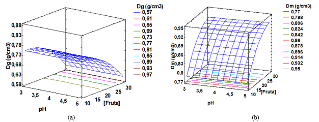 Densidad aparente: El ANOVA para la densidad aparente del cocristalizado de pulpa de guayaba (Dg) y de jugo de maracuyá (Dm) (Tabla 3) muestran que la interacción al igual que los efectos principal y cuadrático de pH no resultaron significativo (con un nivel de confianza del 95,0 %). Consecuentemente, se considera eliminar este factor de los modelos estadístico. Los estadísticos r2 indican que el modelo así ajustado explica en un 86,23 % y 99,32 % la variabilidad de la densidad aparente del cocristalizado de pulpa de guayaba y de jugo de maracuyá, respectivamente. Por tanto, la densidad aparente de los cocristalizados depende sólo de la concentración de fruta, ejerciendo el efecto cuadrático de la fruta una mayor influencia sobre la densidad aparente del cocristalizado que los efectos principales (Figura 2).