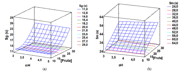 El tiempo de solubilidad de cocristalizado de guayabas aumentó (solubilidad disminuyó) con el contenido de fruta (Figura 4) de forma exponencial, mientras el cocristalizado de maracuyá presentó un comportamiento casi lineal, por lo cual la solubilidad del cocristalizado de este último, aumento en menor proporción con el contenido de fruta. La máxima solubilidad (menor tiempo de solubilidad) del cocristalizado de guayaba, que se puede obtener según el modelo, fue de 11,91 s, a pH de 4,4 % y 13,1 % de pulpa, y la de cocristalizado de jugo de maracuyá fue de 26,00 s a pH de 3,00 % y 10,00 % de jugo. Esto se explica por la menor densidad aparente del cocristalizado de pulpa de guayaba, y su porosidad, según sugiere [40], resultando que la solubilidad de las muestras podría, por tanto, estar más influenciada por la composición de la fruta y su proporción que por la azúcar refinada comercial [45].