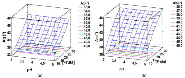 Ángulo de reposo: El ANOVA para el ángulo de reposo de los cocristalizados de pulpa de guayaba (Ag) y de jugo de maracuyá (Am) (Tabla 5) muestra que la interacción, al igual que los efectos principal y cuadrático de pH, no presentaron diferencia significativa sobre los ángulos de reposo, dependiendo sólo de la concentración de la fruta en la mezcla.