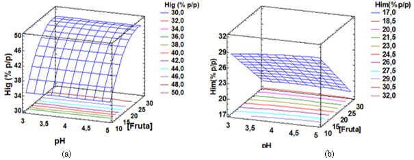 Higroscopicidad del cocristalizado: El ANOVA para la higroscopicidad del cocristalizado de pulpa de guayaba (Hig) y de jugo de maracuyá (Him) (Tabla 6) muestra que la interacción no presentó diferencia significativa (con un nivel de confianza del 95,0 %), al igual que los efectos principal y cuadrático de pH. Consecuentemente, se considera eliminar este factor de los modelos estadístico. Los estadísticos r2 indican que el modelo así ajustado explica 92,28 % y 97,37 % la variabilidad de la higroscopicidad del cocristalizado de pulpa de guayaba y de jugo de maracuyá, respectivamente, por lo que la higroscopicidad de los cocristalizados depende sólo de la concentración de fruta, ejerciendo el efecto cuadrático de la concentración de fruta una mayor influencia sobre la humedad del cocristalizado de guayaba (que los efectos principales (Figura 6a). Sin embargo, para el cocristalizado de maracuyá tiene mayor incidencia los efectos principales (Figura 6b).