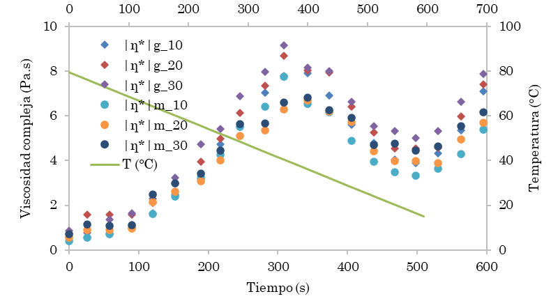 Para determinar la cinética de cristalización se tomaron muestras de la mezcla de solución de sacarosa con concentraciones de fruta de 10 %, 20 % y 30 % y se llevó al reómetro TA Instrument AR 1500ex, donde se realizó una rampa de temperatura desde 80 °C a 15 °C a 1 Hz de frecuencia y torque de 10 micro Nm, descendiendo 6,5 °C/min, obteniéndose valores de viscosidad compleja vs tiempo.