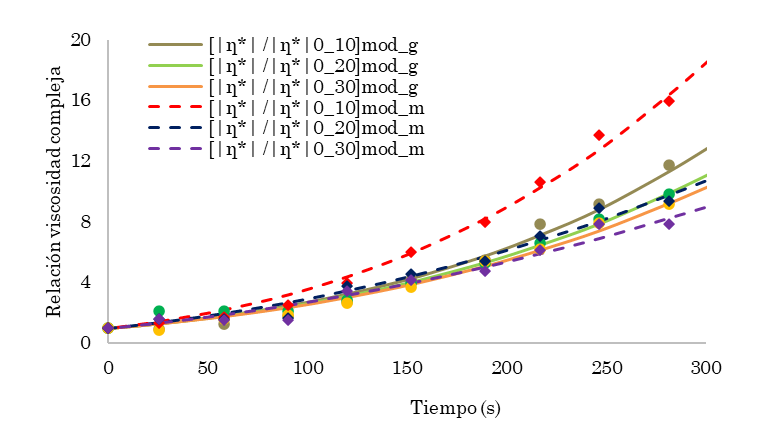 Los datos experimentales de viscosidad compleja se ajustaron al modelo matemático (1) propuesto por [26] para representar la viscosidad compleja a lo largo del proceso de cristalización de un sistema, que representa el comportamiento cinético de cristalización.
