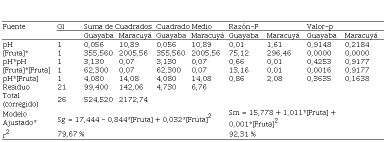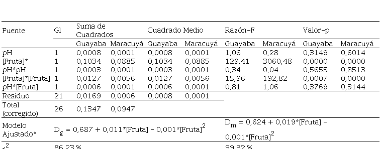 Solubilidad: El ANOVA para la solubilidad de cocristalizado de pulpa de guayaba (Sg) y de jugo de maracuyá (Sm) (Tabla 4), muestra que la interacción no presentó diferencia significativa (con un nivel de confianza del 95,0 %), al igual que los efectos principales y cuadrático de pH. Consecuentemente, se considera eliminar este factor de los modelos estadístico.