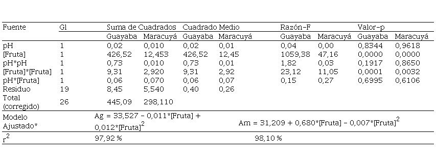 Consecuentemente, se considera eliminar este factor de los modelos estadísticos. Los estadísticos r2 indican que el modelo así ajustado explica 97,92 % y 98,10 % la variabilidad del ángulo de reposo del cocristalizado de pulpa de guayaba y de jugo de maracuyá, respectivamente.