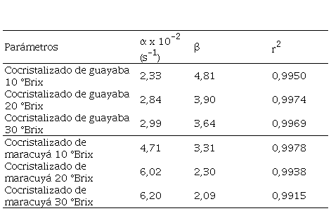 Los valores de α aumentaron con la concentración de fruta utilizadas en el proceso de cocristalización (Tabla 7), obteniéndose valores mayores en el cocristalizado de jugo de maracuyá que en el de pulpa de guayaba, indicando que la viscosidad compleja del cocristalizado es favorecida con el aumento de la concentración de fruta en el proceso de cocristalización, siendo esta mayor en los cocristalizado de jugo de maracuyá que en los de pulpa de guayaba.